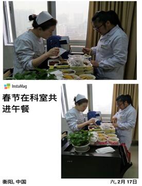 年初一中午,劉燕護士與鐘嵐醫(yī)生在科室共進午餐,匆匆忙忙吃了一頓簡簡單單的盒飯就繼續(xù)工作了。