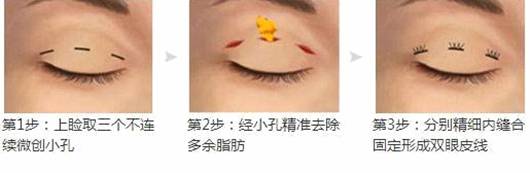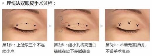 就是我們說(shuō)的韓式三點(diǎn)。設(shè)計(jì)好雙眼皮形狀后,在眼皮上制作3個(gè)長(zhǎng)度2-3毫米的小口。然后再對(duì)這些3個(gè)小口進(jìn)行縫合。