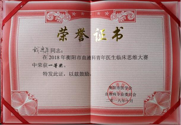 獲獎喜訊 發(fā)布時間:2018年10月24日 11:46:18 預覽:2349次 通訊員聶柳柳報道:為加強青年醫(yī)生的基礎知識、基本理論、培養(yǎng)實用型醫(yī)學人才,衡陽市血液病學專業(yè)委員會于2018年10月20日,舉行血液科青年醫(yī)生臨床思維大賽。比賽共分為6隊:它們分別是南華附一血液科隊、南華附一兒科血液隊、南華附二隊、附屬南華醫(yī)院隊、解放軍169隊及衡陽市中心醫(yī)院與祁東縣人民醫(yī)院聯(lián)合隊。參賽選手多為各醫(yī)院的年輕醫(yī)護人員,本次比賽內(nèi)容包括典型心電圖判斷,典型CT判讀,典型細胞形態(tài)改變,典型骨髓圖片、疾病分期分型治療方案等相關醫(yī)學知識。其中腫內(nèi)一區(qū)的戴建華代表衡陽市中心醫(yī)院參加本次比賽,秉著扎實的理論知識,沉著應對,經(jīng)過強烈角逐從6個代表隊脫穎而出,榮獲一等獎。 全市醫(yī)務工作者以此次比賽為契機,認真學習,刻苦鉆研業(yè)務技術(shù),爭做一名德藝雙馨的醫(yī)務工作者,為保障人民群眾的身體健康和生命安全做出新的貢獻!