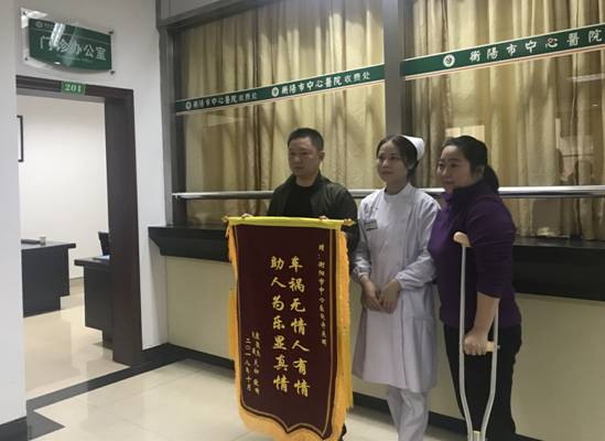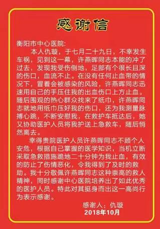 7月29日星期天上午,袁俊杰、仇璇兩夫妻帶著小孩騎摩托車從香格里拉小區(qū)出來,途中不幸被急馳的小車掛傷,造成左足跟部撕裂傷約16cm,流血不止。被巧遇從此路過的護(hù)士許燕暉看到和聽到呻吟聲,她迅速走近傷者面前,并及時讓旁邊人呼叫120,當(dāng)天上午近11點鐘,烈日當(dāng)空的地上滾燙,她依然穿著短裙赤腳跪在熱地板上20多分鐘不顧被傷者流血感染徒手壓著傷口上方止血,同時又測量傷者脈搏心跳,觀察面色有無異常,還不斷地安慰傷者,等120救扶車趕到才悄然離開。后經(jīng)傷者方多方打聽才得到基本線索,許燕暉認(rèn)為自己只是做了一件很平常的事,所以一直隱姓埋名三個月里從沒有言說。之后,傷者仇璇的愛人袁俊杰送病人到衡陽市中心醫(yī)院看病,在門診大廳無意間碰到了許燕暉,感覺面熟,最后從側(cè)面才得知確切的信息。10月25日,袁俊杰護(hù)著已經(jīng)出院多日但還沒有痊愈仍柱著拐杖的妻子前來衡陽市中心醫(yī)院門診辦公室送上錦旗和感謝信,以表真誠的感恩。許燕暉,雖然來衡陽市中心醫(yī)院門診部工作近一年,平常工作積極主動,微笑服務(wù),早出晚歸,樂于幫助病人,多次拾金不昧,應(yīng)對突發(fā)事件處置能力強(qiáng),溝通能力好,深受大家好評。