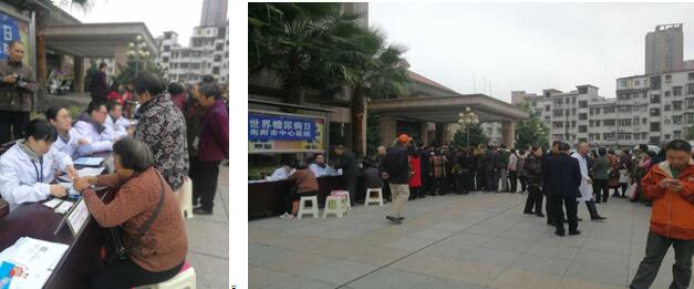 為迎接2018年世界糖尿病日,11月14日,衡陽市中心醫(yī)院的醫(yī)護(hù)人員赴耒陽市五里牌社區(qū)開展“藍(lán)光行動:家庭與糖尿病”大型義診活動。